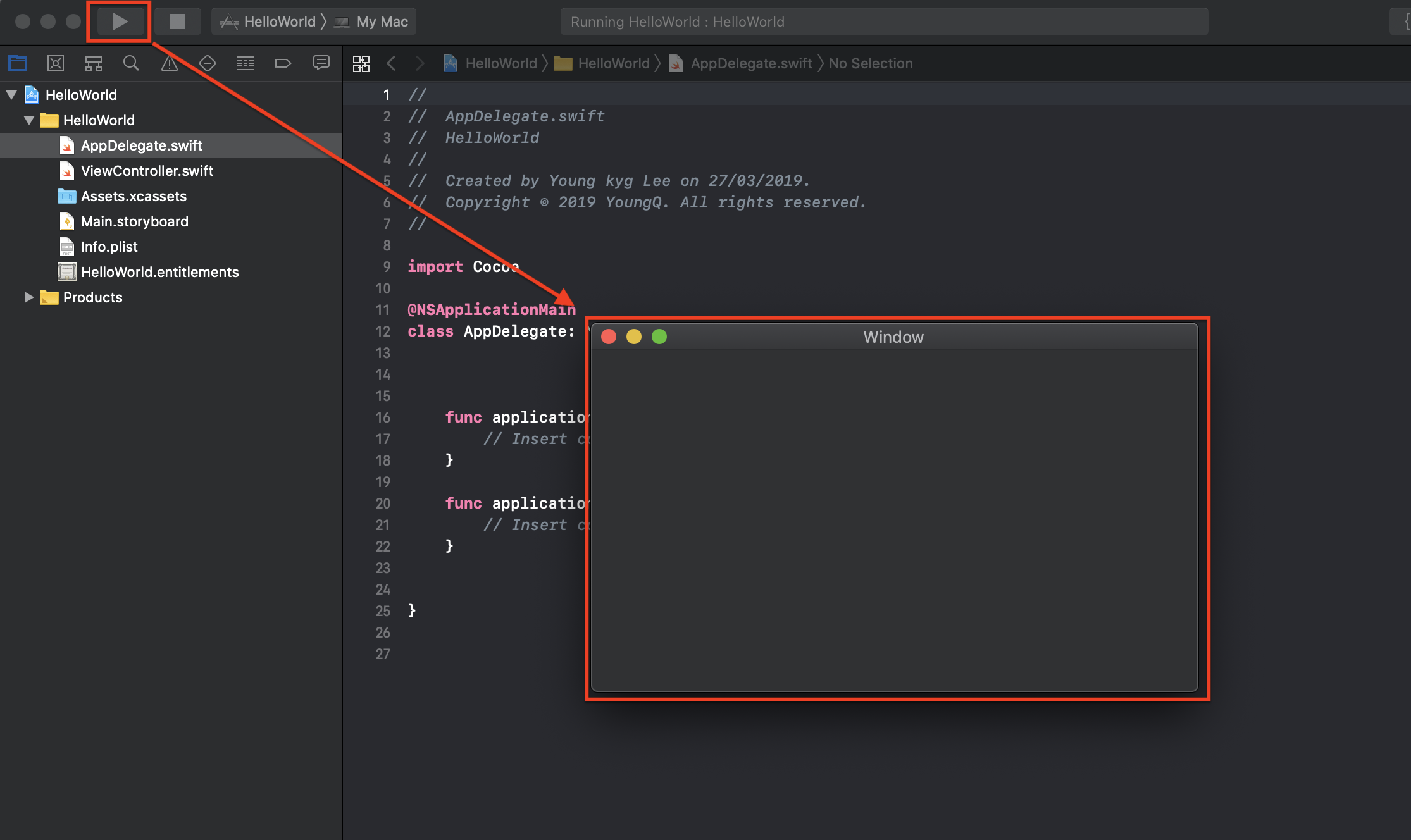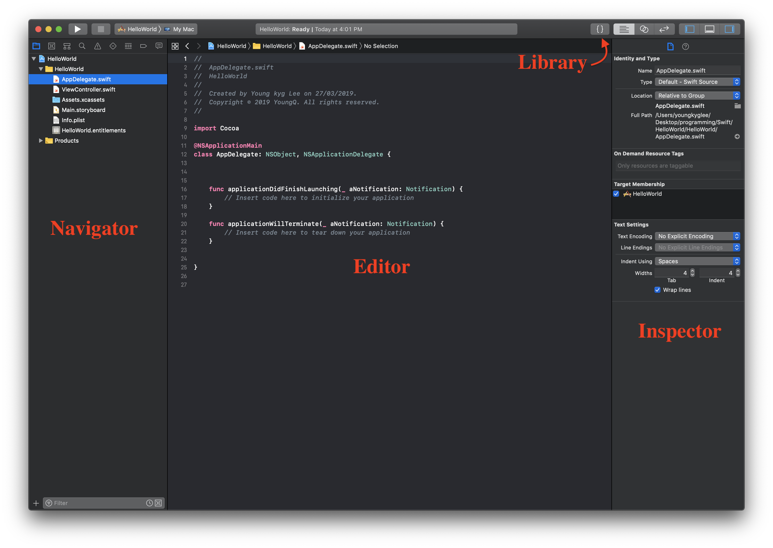 위와 같이 Xcode는 3가지 부분으로 나눠지게 됩니다.