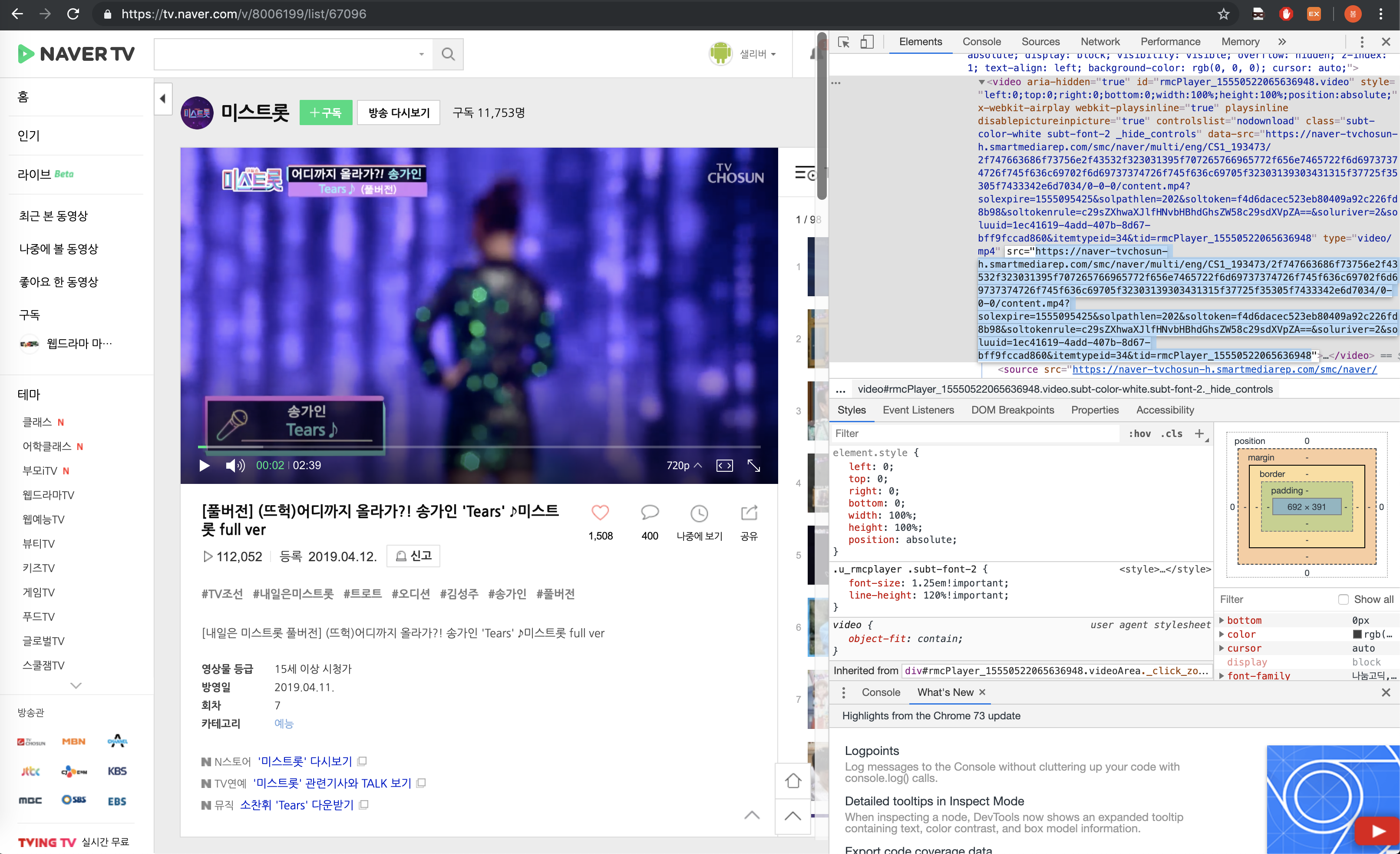 크롬의 [검사] 기능을 이용해서 동영상의 소스를 찾아봤습니다.