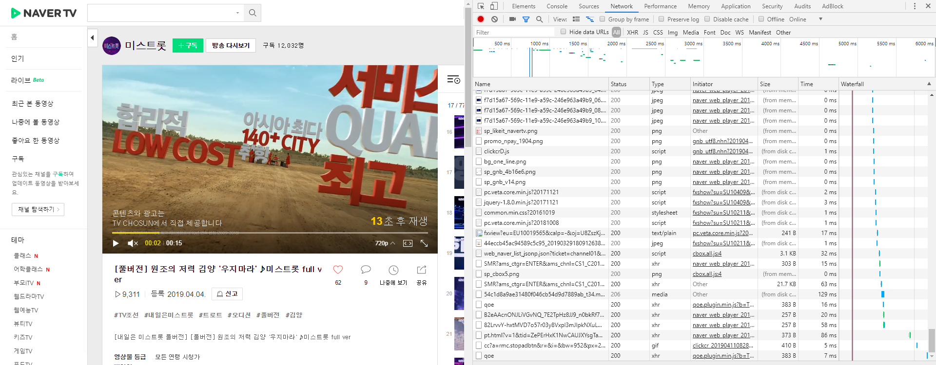 15초 광고 후 재생의 경우에는 확인해보니 광고가 재생되는 시점에 웹브라우저가 서버로부터 광고 후 재생될 영상의 url을 전송받는 것을 확인할 수 있었습니다.