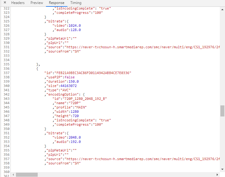 위 화면에서 "source" : "~~~" 라고 되어있는 부분이 영상의 URL이 되는 부분입니다.