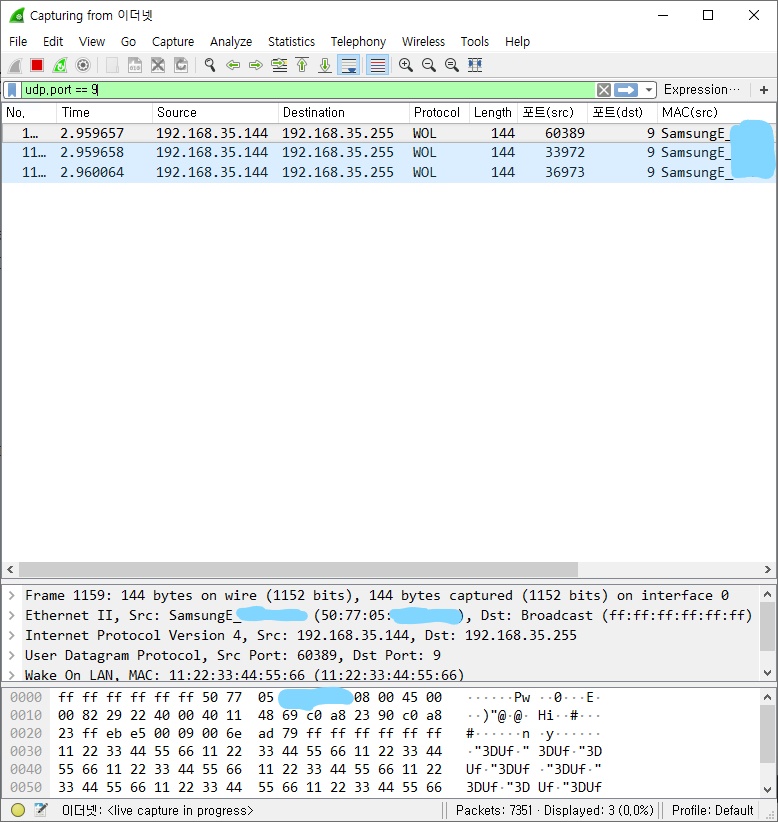 WOL이 사용하는 udp 9번 포트를 필터링한 결과 3개의 패킷이 전송된 것을 볼 수 있었습니다.
