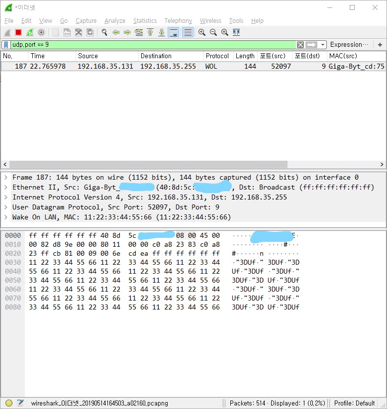 는것처럼, 전송결과 WOL프로토콜로 인식되는 패킷을 송신하는 것을 볼 수 있었습니다.