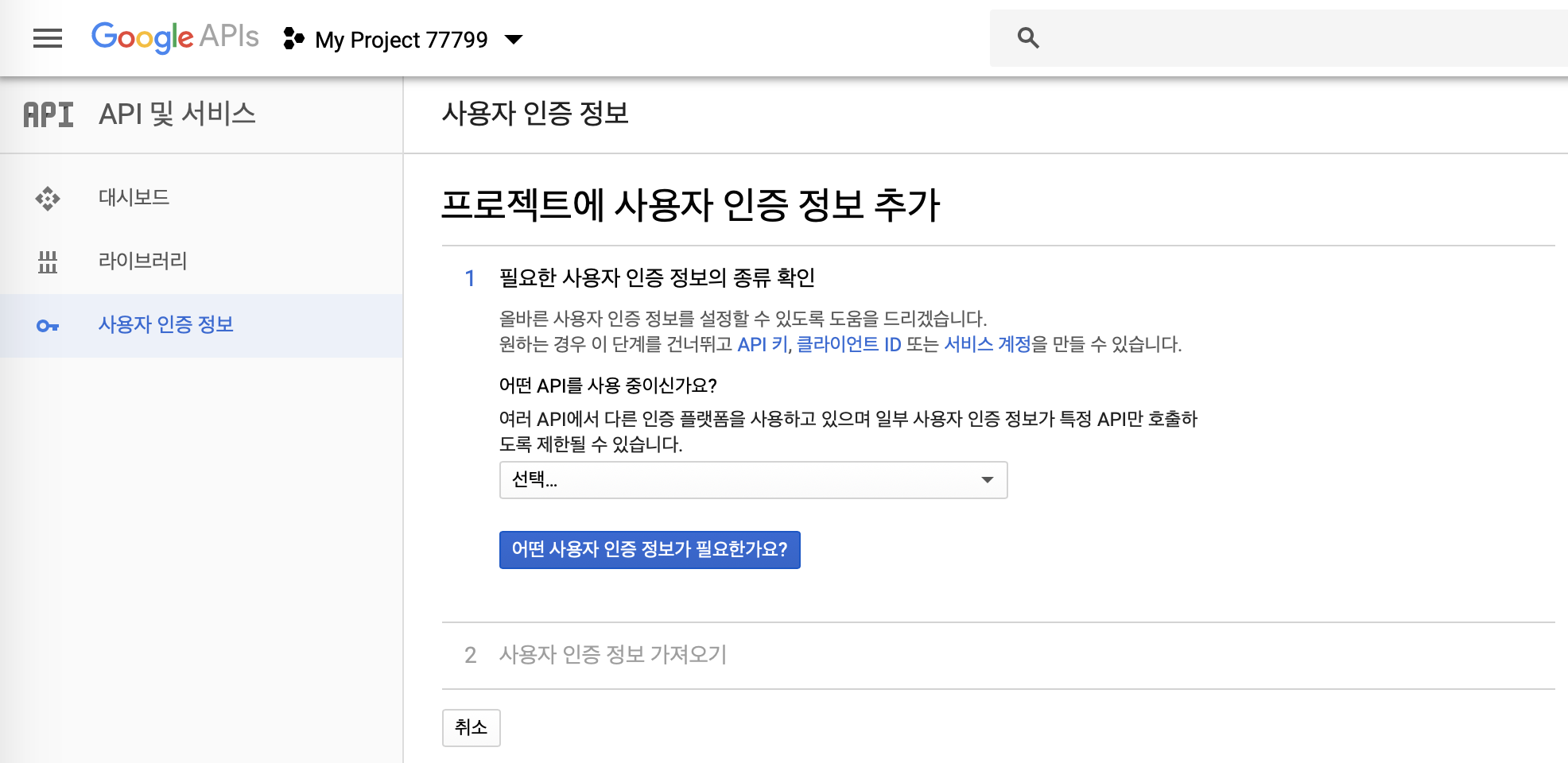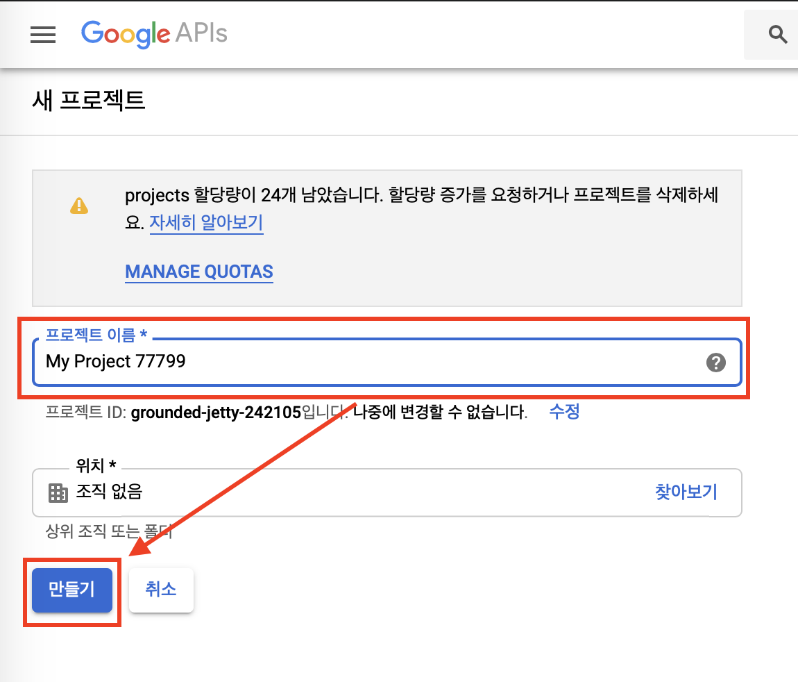 프로젝트 이름은 본인이 사용할 API들을 관리하는 하나의 큰 틀이라고 생각하시면 좋습니다.