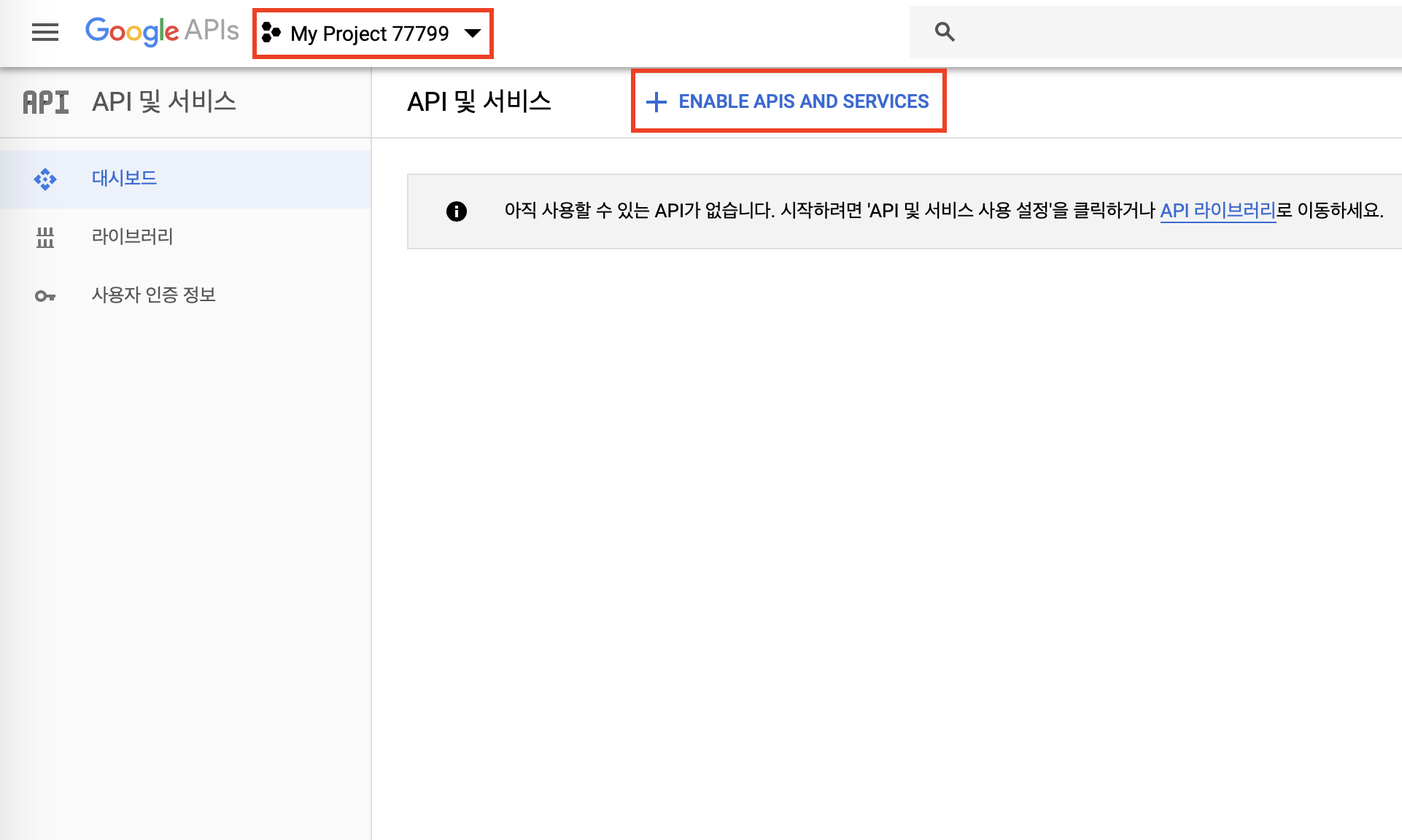 위와같이 프로젝트가 생성이되면, [EABLE APIS AND SERVICES]를 클릭하여 프로젝트에 API를 새로 추가하겠습니다.