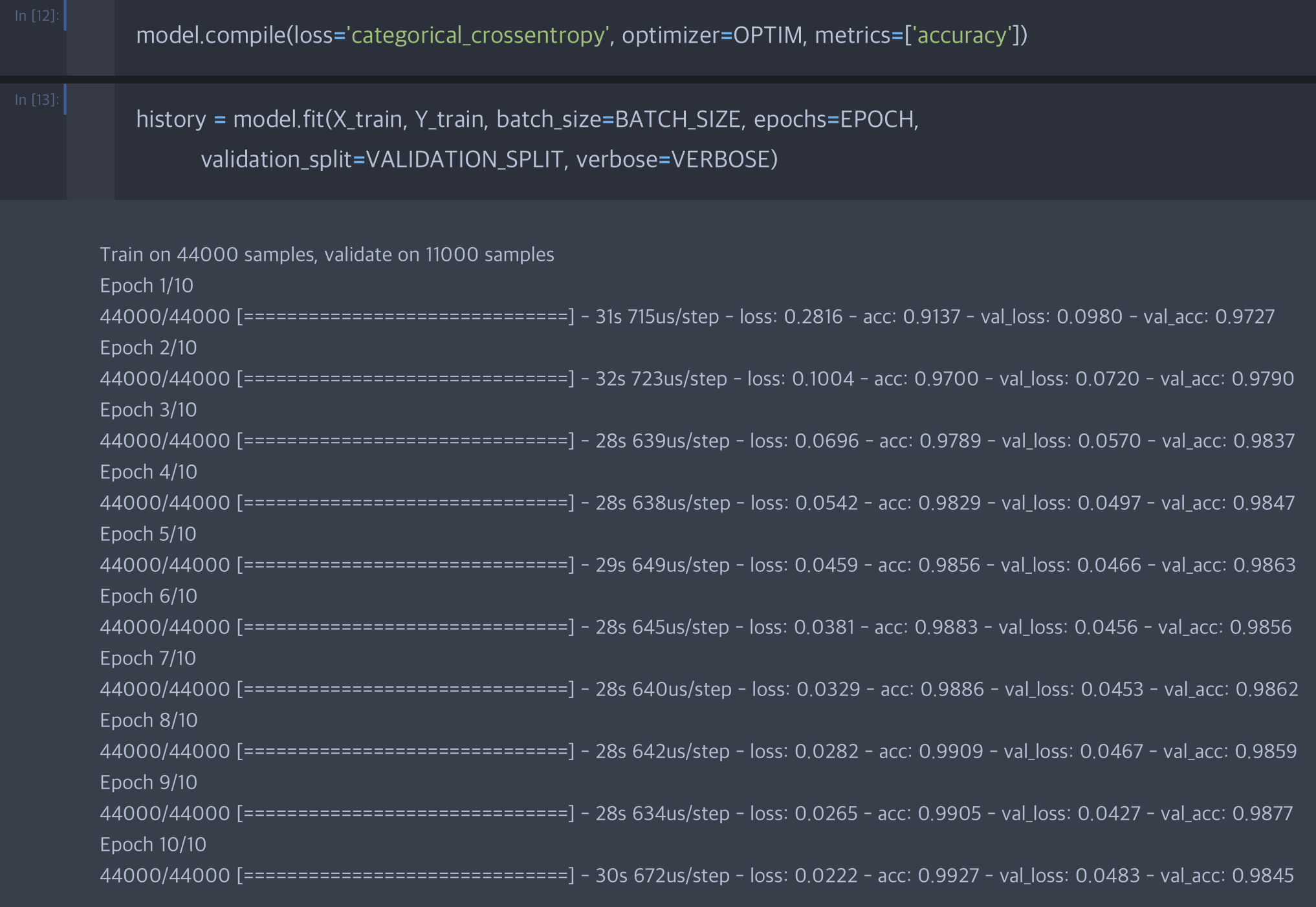 - VALIDATION_SPLIT : 학습시 데이터를 일부 나눠서 Validation으로 사용할 비율을 의미합니다.