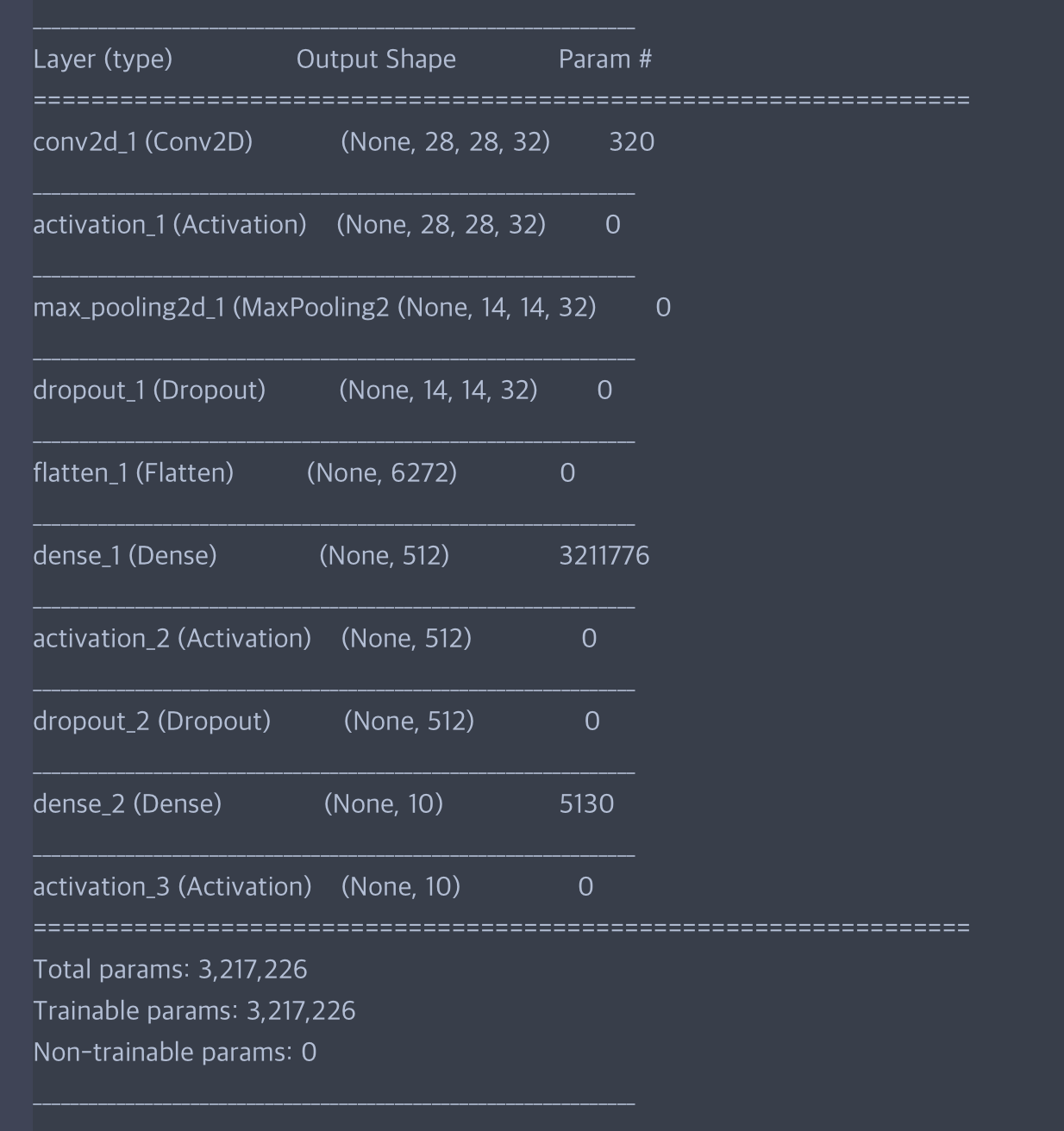 Convolution 단계 하나를 거친 후 바로 Flatten해서 바로 하나의 네트워크를 거쳐 Y값으로 나가는 정~~~~말 간단한 모델입니다.