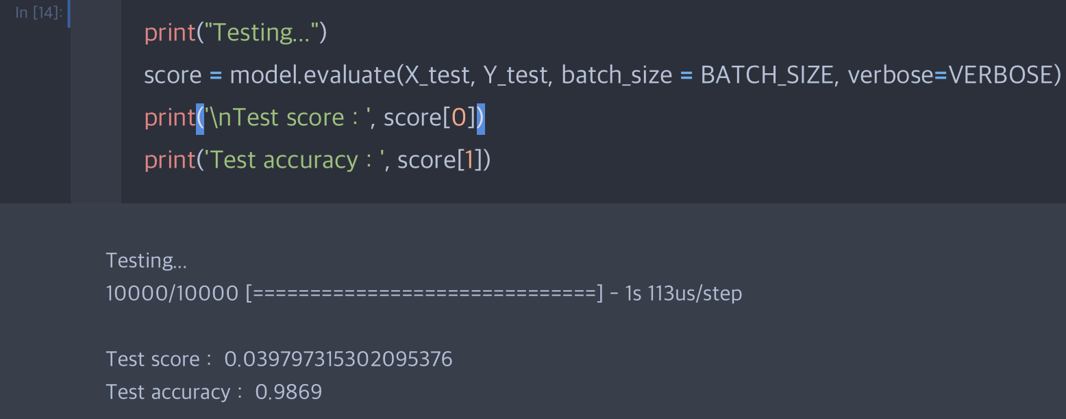 evaluate 함수를 이용해서 최종적으로 test accuracy를 확인해보니 98.7% 정도가 나오네요.