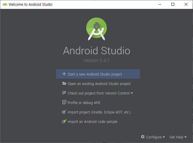 위와같이 설치가 종료되면 맨 위 [Start a new Android Studio project]를 클릭합니다.