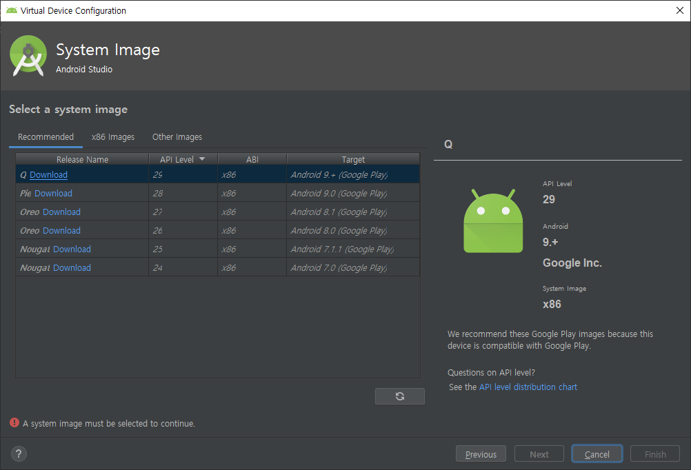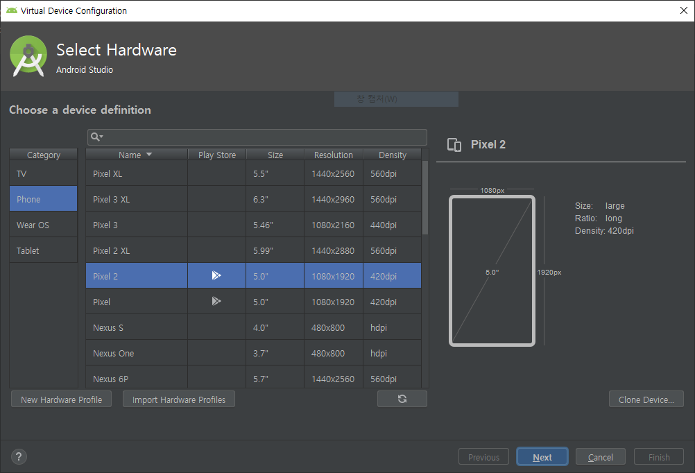 에뮬레이터에서 실행할 휴대폰을 선택하는 부분입니다. 다는 구글의 Pixel2를 선택했습니다.