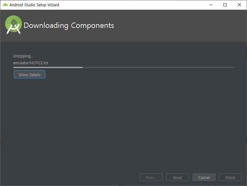 이건 안드로이드 스튜디오에 필요한 추가적인 것들을 설치하고 셋팅하는 과정입니다. 최초 설치 후 1회면 하면되기 때문에 완료될 때까지 커피한잔...