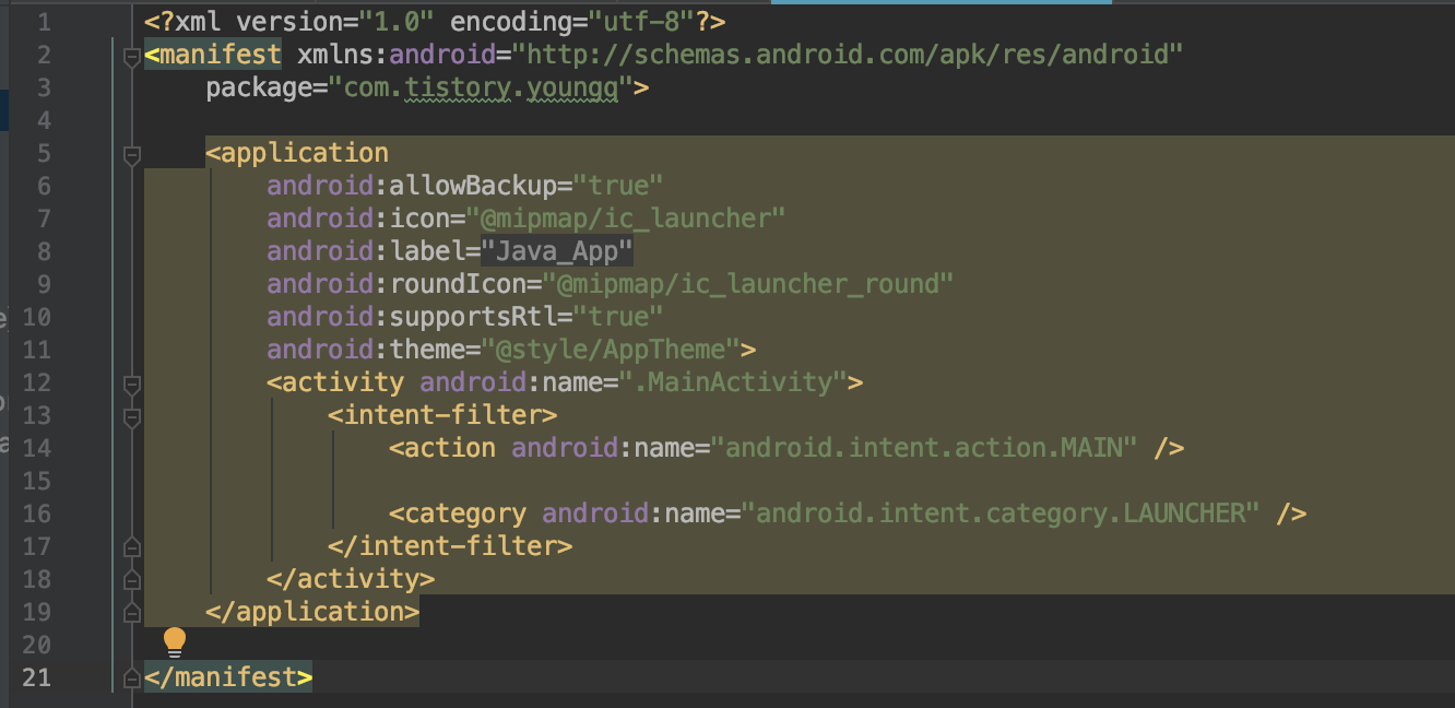 이 후 <activity android:name=".MainActivity">라는 영역이 있습니다.