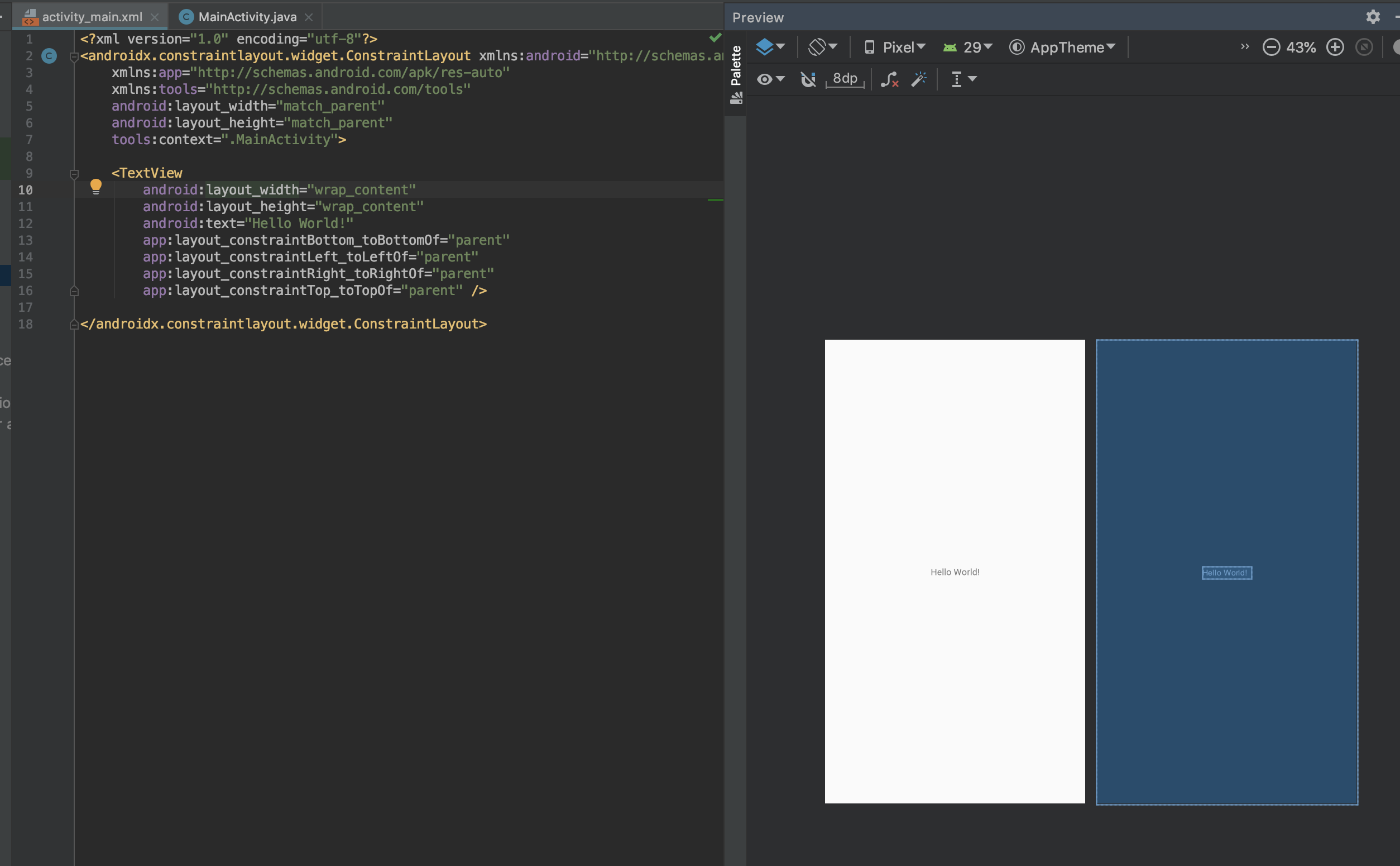 처음 프로젝트를 생성하고, [ activity_main.xml ] 의 하단에보면 Design과 Text가 있는데 Text로 이동해보면 아래와 같은 모습을 볼 수 잇습니다.