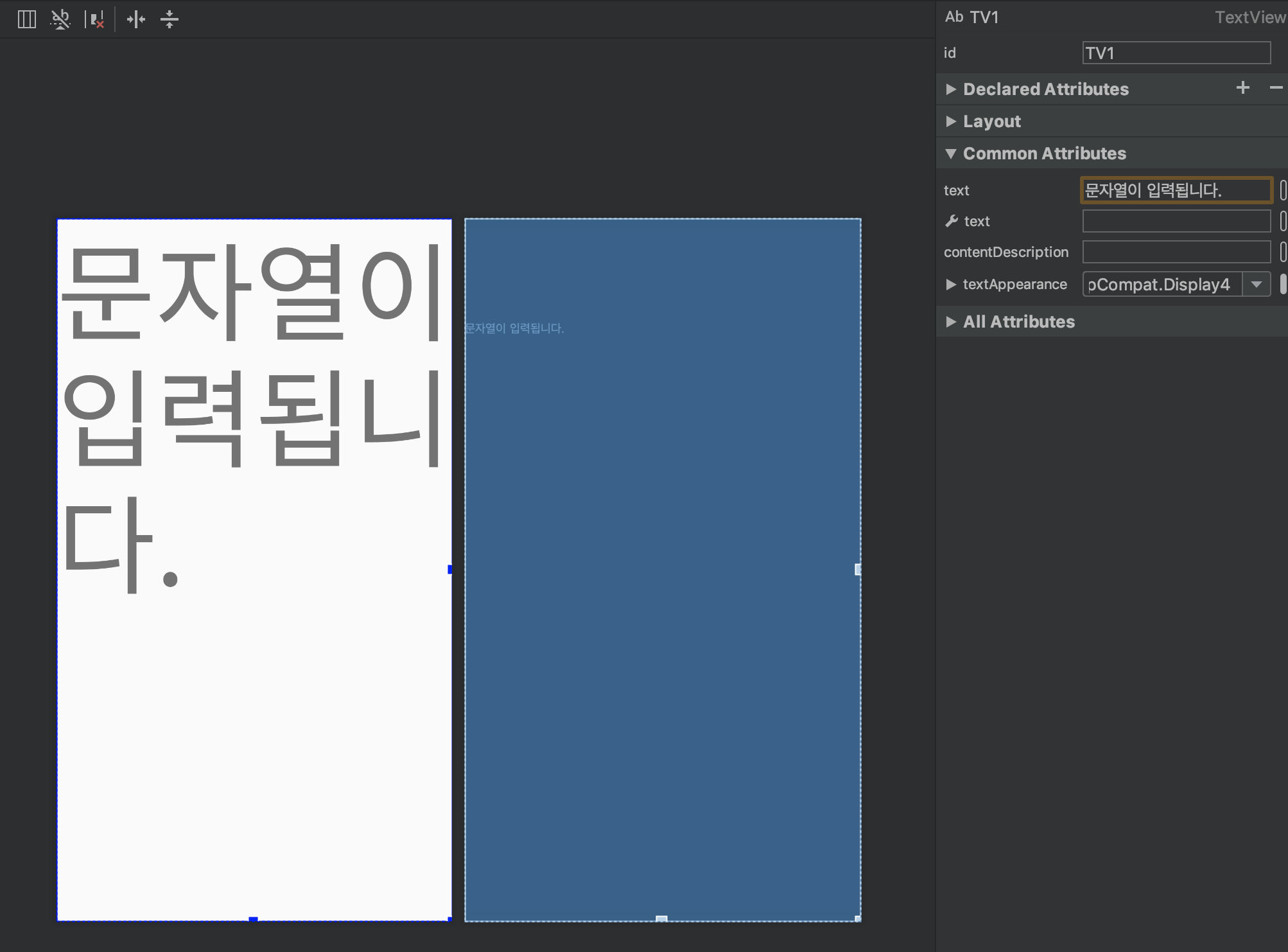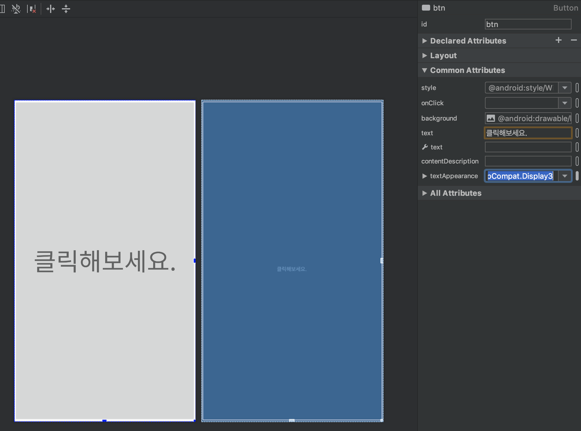 위와같이 2개의 버튼과 textView를 만들었습니다. (괄호 안에 값 = ID)