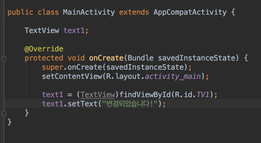 이후 setContentView를 통해서 activity_main.xml을 갖고온 후 findViewById라는 메서드를 통해서 위에서 만든 TextView의 ID값(TV1)을 통해서 해당 TextView를 갖고와 text1 변수에 넣어주었습니다.