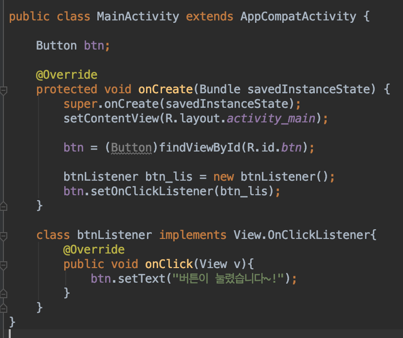 그리고 해당 클래스 객체를 생성해서 btn의 OnClickListener로 설정해 주는 것을 볼 수 있습니다.