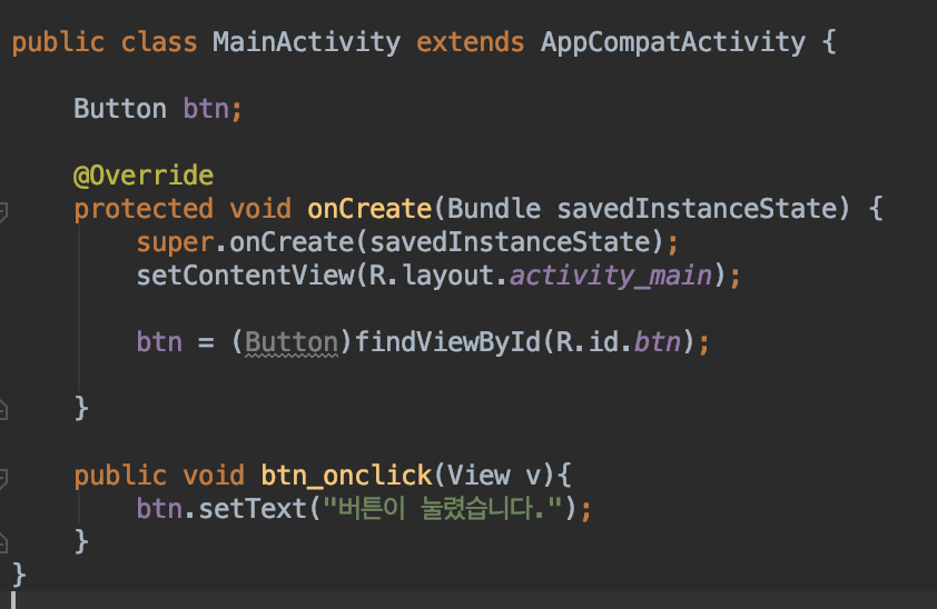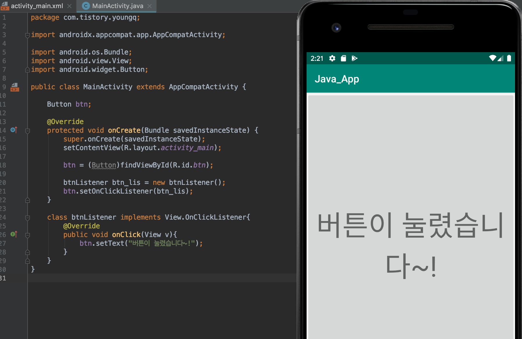 아래는 Java파일에서 Button의 onClick메서드를 설정해주는 과정입니다.