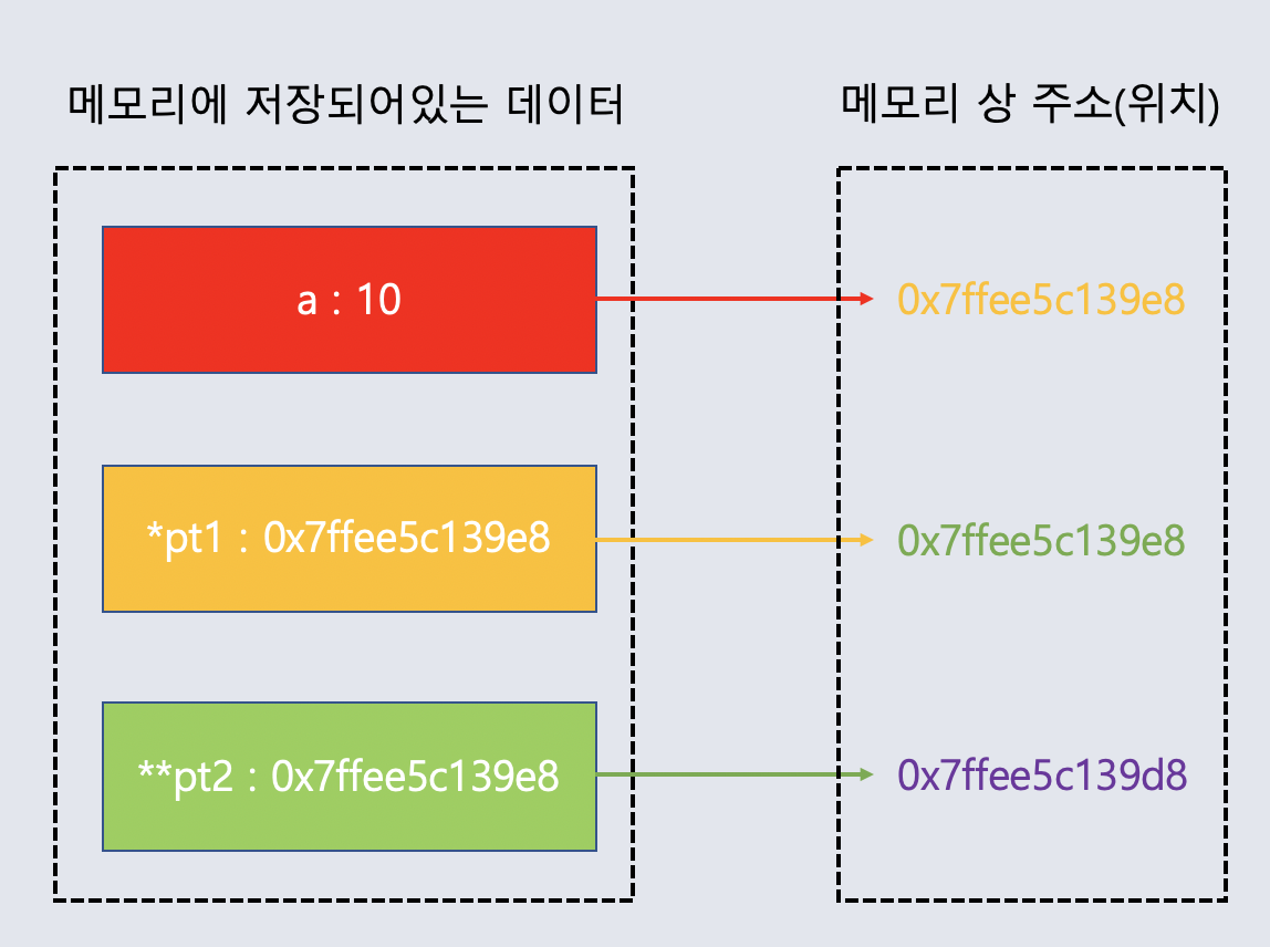 1개의 포인터(*)는 변수의 주소를 직접 갖고 있다는 의미입니다.