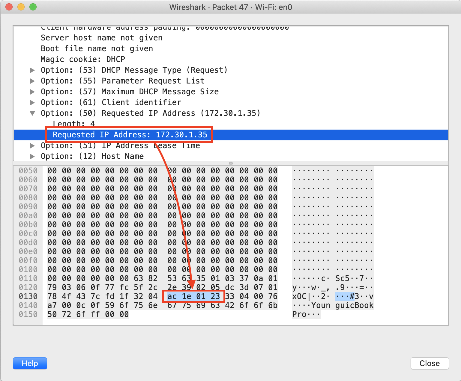 DHCP Request Message를 자세히 보게되면 아래와 같은 [Requested IP Address]라는 항목이 존재합니다.