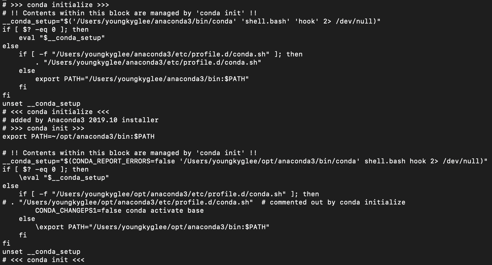 흠... 잘 보시면, 중간에 < #added by Anaconda3 2019.10 installer > 라는 부분이 있습니다. 해당 부분을 보게되면 경로설정 영역에 분명하게 '/opt/' 라는 부분이 존재합니다.