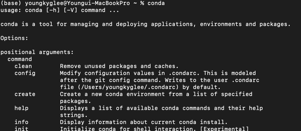 환경변수도 잘 들어갔고 conda와 같은 명령어도 아래와같이 정상적으로 실행되는 것을 볼 수 있었습니다.