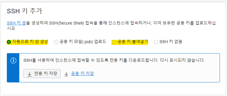 일반적으로 '자동으로 키 쌍 생성' 또는 '공용 키 붙여넣기'를 통해 SSH 키를 생성/설정 하여 사용하게 되는데요.
