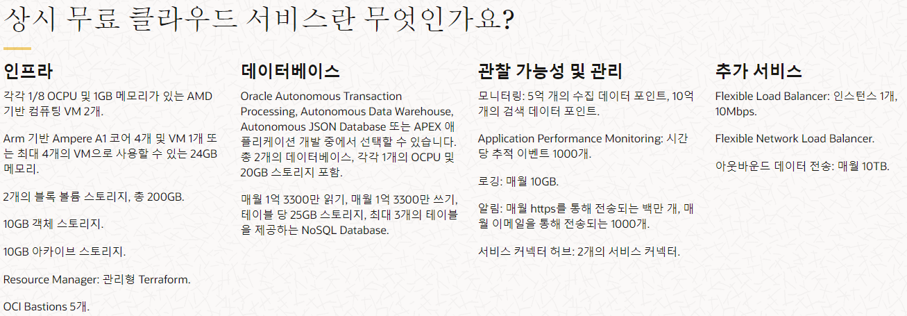 하지만, Free Tier 정책에서는 다른 퍼블릭클라우드와 비교해도 충분히 좋은 스팩을 제공하기 때문에 해당부분만 잠깐 살펴보고 본문으로 들가겠습니다.