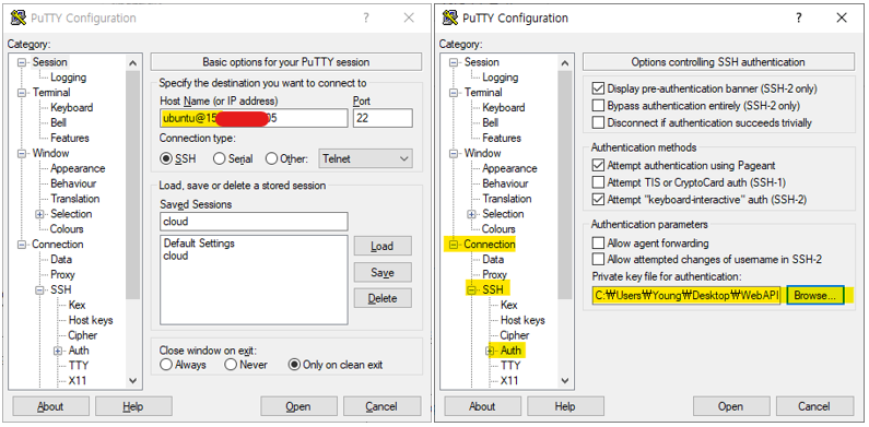 Putty 접속은 위와같이 넣어주시면 됩니다.